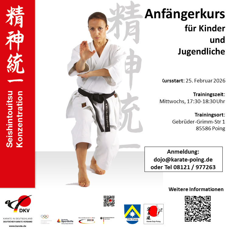 Das Karate Dojo des TSV Poing bietet ab dem 25.Februar 2026 wieder einen Anfängerkurs für Kinder und Jugendliche an.